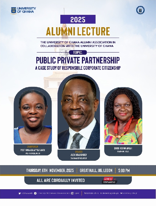 The Executive Chairman of KGL Group, Mr. Alex Apau Dadey, is set to deliver an address on "Public Private Partnership: A case study of Responsible Corporate Citizenship" at a programme organised by the University of Ghana Alumni Association in collaboration with the University of Ghana.