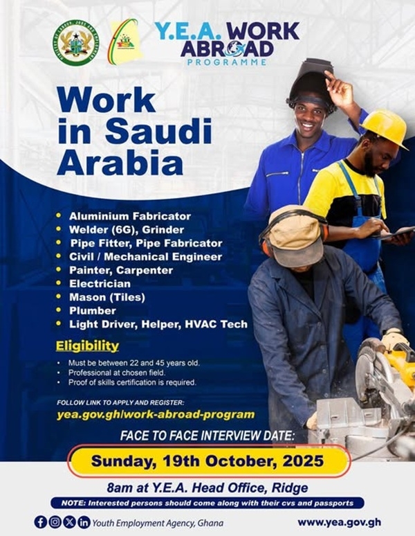 The Youth Employment Agency (YEA) has announced new overseas job opportunities for skilled Ghanaian professionals seeking employment in Saudi Arabia under its YEA Work Abroad Programme.