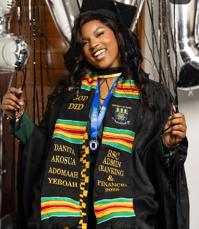 The celebrated performer, born Danita Akosua Adomaah Yeboah, shared the news with fans on Facebook alongside her graduation photos, captioning the moment with gratitude and faith.