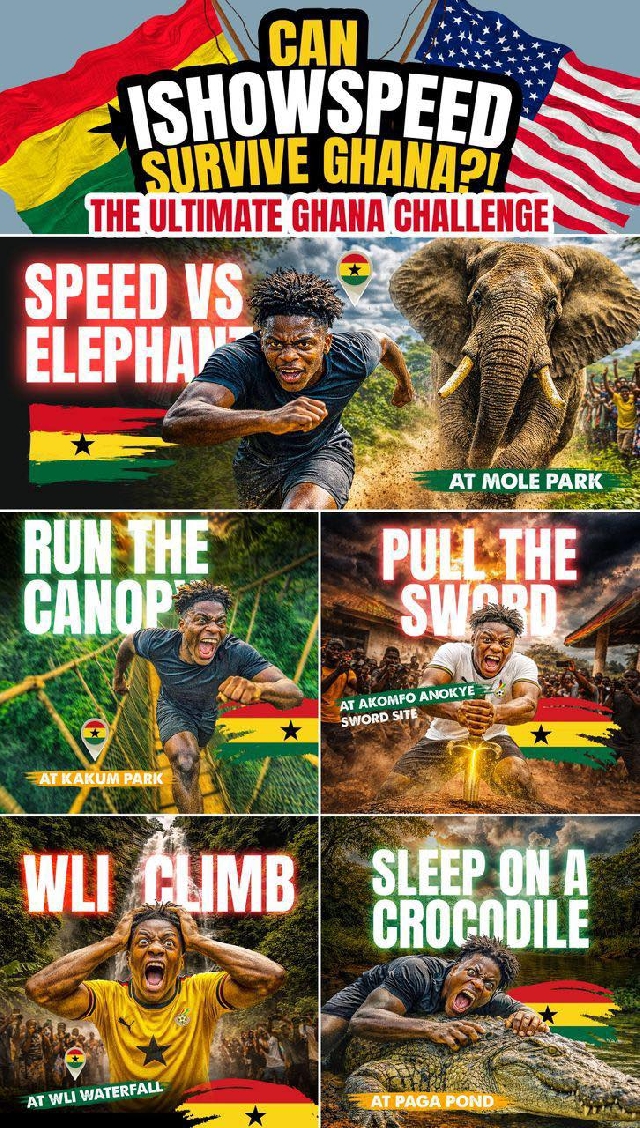 The itinerary includes a visit to Mole National Park, where IShowSpeed will have the chance to observe and interact with elephants in their natural habitat. He will also visit the Paga Crocodile Pond, a site famous for its centuries-long coexistence between humans and crocodiles, to test his courage.