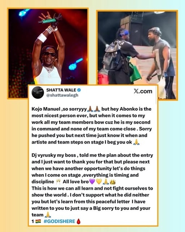 Ghanaian dancehall star Shatta Wale has publicly apologised after a brief on-stage altercation involving his bodyguard, Abonko, and Mc Kojo Manuel.
