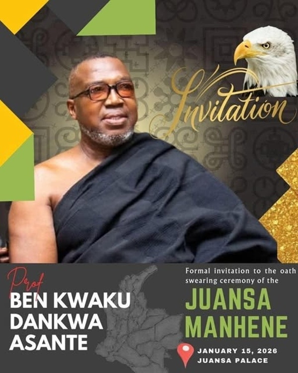 The newly elected Juansahene Dehyeɛ, Professor Ben Kwaku Dankwa Asante, former Chief Executive Officer of Ghana Gas Company Limited, is expected to formally swear the oath of office to the people of Juansa in the Ashanti Region on January 16.