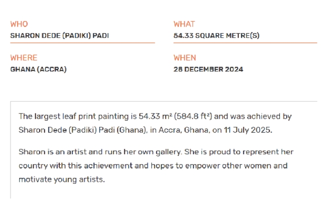 Ghanaian visual artist Sharon Dede Padi, fondly known as Padiki, has etched her name into history, becoming the first Ghanaian to claim a Guinness World Records (GWR) title for creating the largest leaf-print painting.