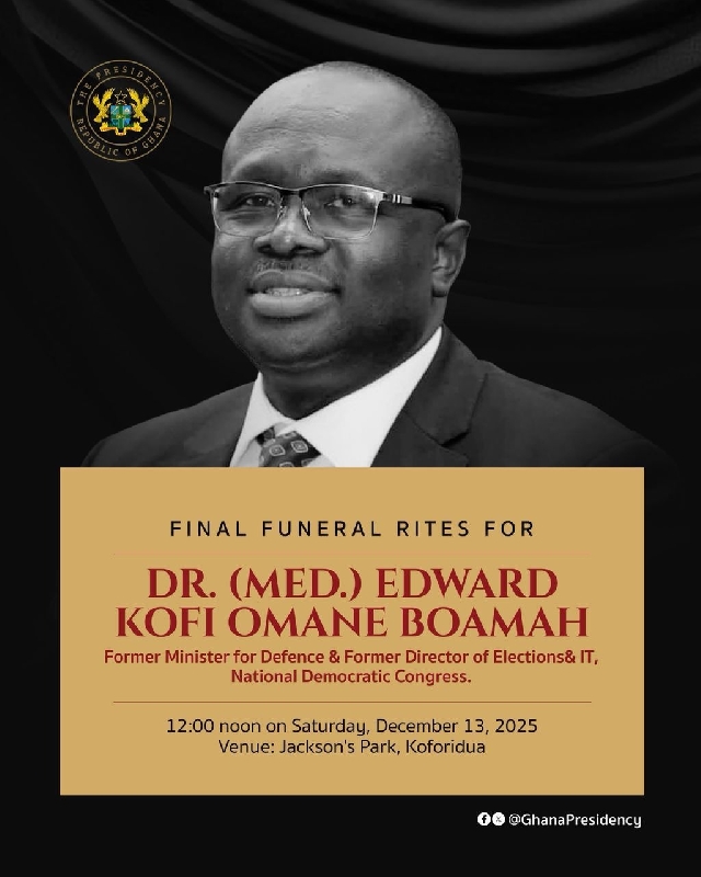 The final funeral rites for Dr. Edward Omane Boamah, former Minister for Defence and immediate past Director of Elections and IT of the National Democratic Congress (NDC), will be held on Saturday, December 13, 2025.