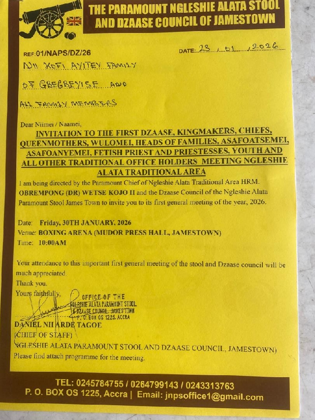 Strong opposition has emerged from segments of the James Town traditional leadership in the Greater Accra Region over the planned general traditional council meeting slated for Friday, January 30, 2026, at the Boxing Arena (Mudor Press Hall). Critics are challenging both the legitimacy and customary authority behind the announced gathering.