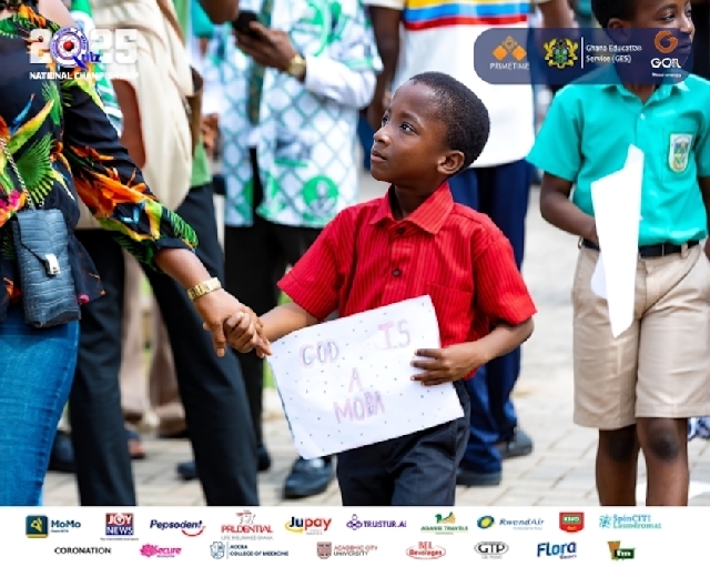 | NSMQ 2025 (Pic): A child in Mfantsipim uniform holding a sign that reads, 'God is MOBA'