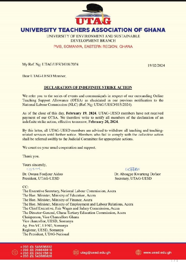 The University of Environment and Sustainable Development (UESD) branch of the University Teachers Association of Ghana (UTAG) has declared an indefinite strike.