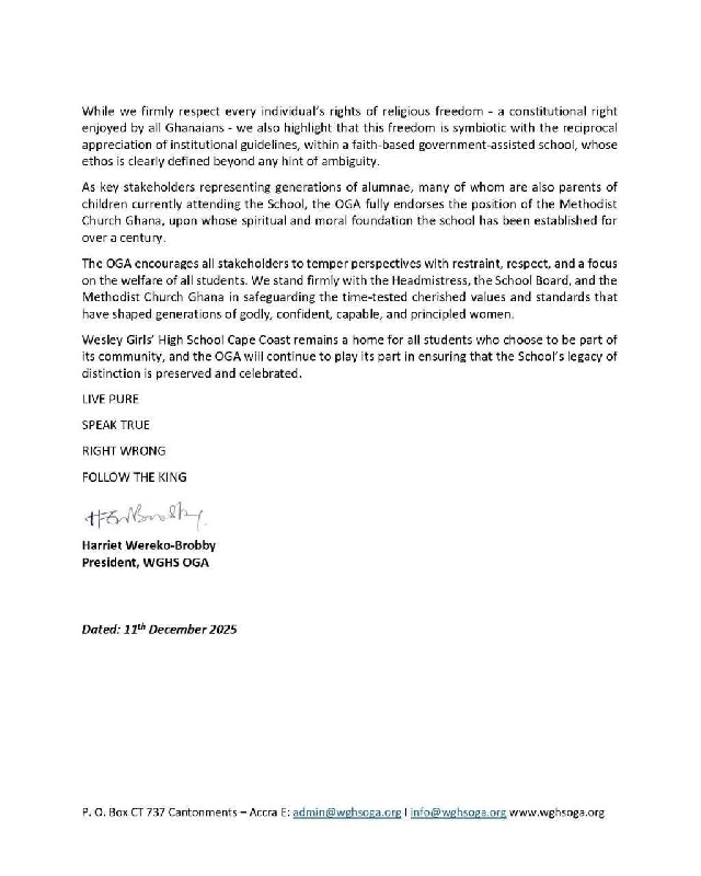 "Recognising that Wesley Girls' High School Cape Coast is home to students from diverse faith backgrounds, the OGA also realises that any allowance made for one particular faith, has to be made for all other faiths in the interests of impartiality. It is neither practical nor sustainable to expect individualised religious accommodations, that could eventually compromise the school's order, safety, and long-standing traditions which underpin its enviable status."