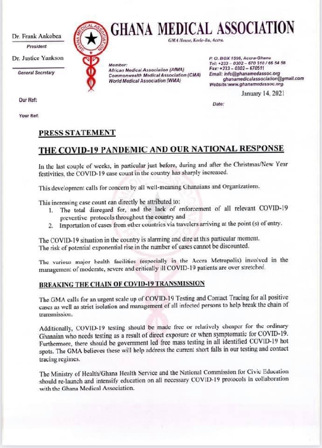 The GMA therefore called for “an urgent scale-up of COVID-19 testing and Contact tracing for all positive cases as well as strict isolation and management of all infected persons to help break the chain of transmission”.