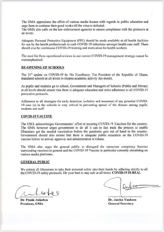 The GMA also stressed the need for the Ghana Health Service, National Commission on Civic Education and the media to continue to intensify public education and awareness on the COVID-19 pandemic, while calling on the law enforcement agencies to ensure compliance with protocols at all levels.