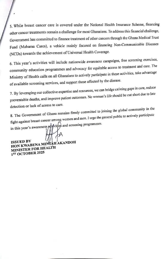 The ministry, in statement dated October 1, 2025, signed by sector Kwabena Mintah Akandoh, announced the 'No One Should Face Breast Cancer Alone'.