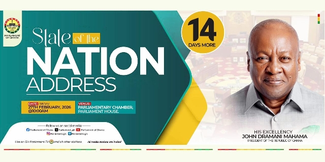 The President of the Republic of Ghana, John Dramani Mahama, will deliver the 2026 State of the Nation Address(SoNA) on Friday, 27th February 2026, at 10:00 AM in the Parliamentary Chamber at Parliament House.