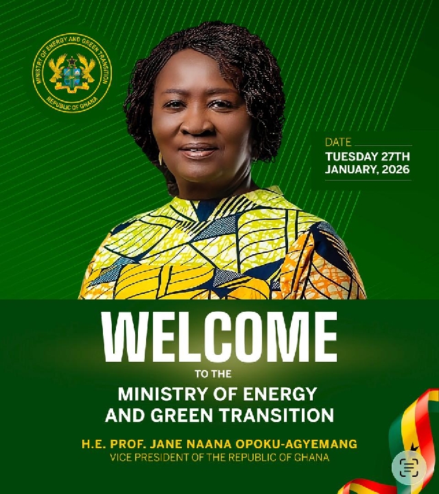 Vice President of the Republic of Ghana, H.E. Prof. Jane Naana Opoku-Agyemang, will today, Tuesday, January 27, 2026, pay a working visit to the Ministry of Energy and Green Transition in Accra.