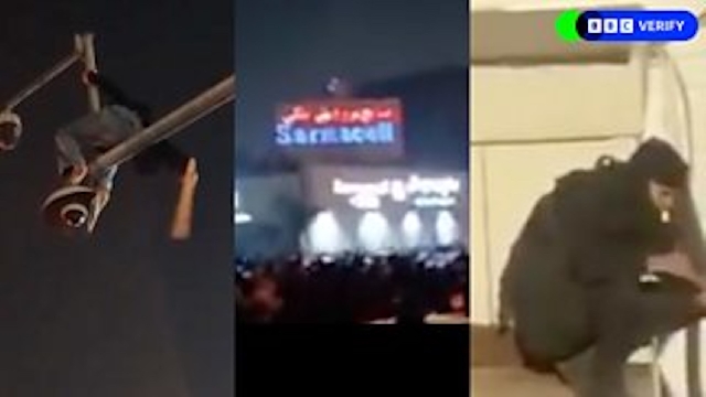 Protesters have also been seen trying to evade Iran's heavy surveillance infrastructure by disabling CCTV cameras. Footage we verified shows one person in the capital climbing up a post and hitting a surveillance camera several times in an attempt to disable it. A huge crowd of protesters can be seen on the ground and heard cheering as the camera is damaged.