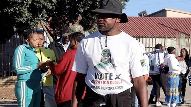 Two men wearing white T-shirts emblazoned with the slogan "Operation Dudula – Mass Deportation" were stationed at the entrance. They demanded that everyone produce their documents before being allowed inside.
